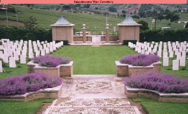 The ANCONA WAR CEMETERY is reached from the town by following the Varono-Camerano road up the hill past the Ancona Communal Cemetery on the left. Continuing straight down the hill for about 200 metres, visitors will find the War Cemetery on the right.