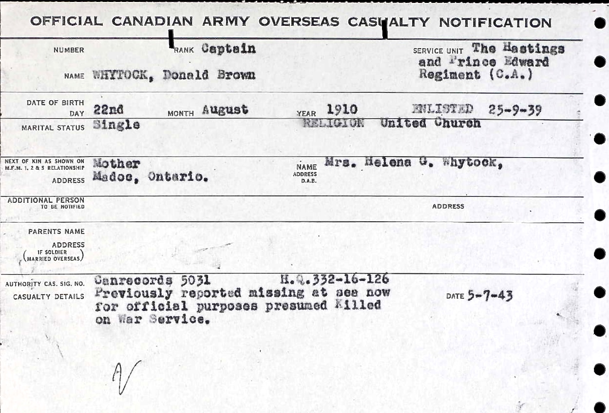 He was one of 53 Canadians who lost their lives on July 4-5, 1943. They were travelling in convoy KMS-18B on their way to Sicily, Italy, for Operation Husky. Three ships (City of Venice, St. Essylt and Devis) were torpedoed and sunk by German u-boats in the Mediterranean Sea near Alger, Algeria.