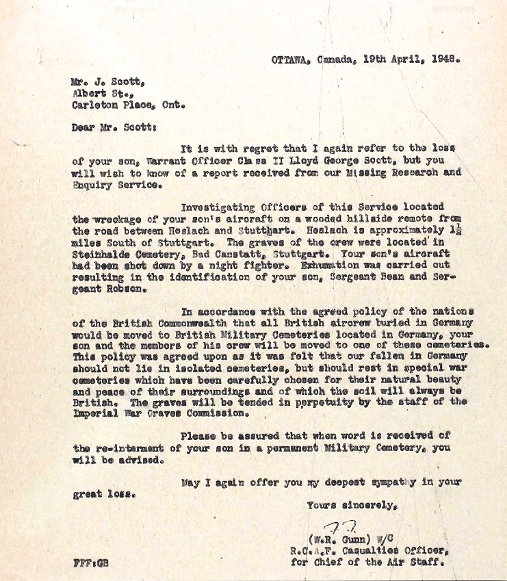 Son of Joshua and Millie Mabel (nee Pretty) Scott of Renfrew, Ontario. Brother of James Oswald, Mary Agnes, Grace Isobel, Mabel Irene and Marjorie Laney. Warrant Officer, Class 2, Lloyd Scott shares a cemetery with Sergeant Russell James and Flight Sergeant William Reynolds, two other lads from Carleton Place.