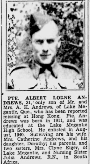 Albert Lorne served in Québec, in Newfoundland with Force W, in Hong Kong with Force C. He had 495 days of service, including 57 overseas.
