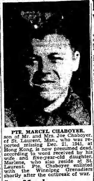 Son of Joseph Edmond Chaboyer and Marie Emma Ducharme, of St. Laurent, Manitoba. Husband of Rose Coutu. Cousin of Privates Chrysostôme Chaboyer, who fought in Europe, and of Wilfrid Chaboyer, service number H-41693, Winnipeg Grenadiers, prisoner of war in Hong Kong, both survived the war, and cousin of David J. Chaboyer, service number H-41688, Winnipeg Grenadiers, killed in action in Hong Kong on 19 December 1941.
