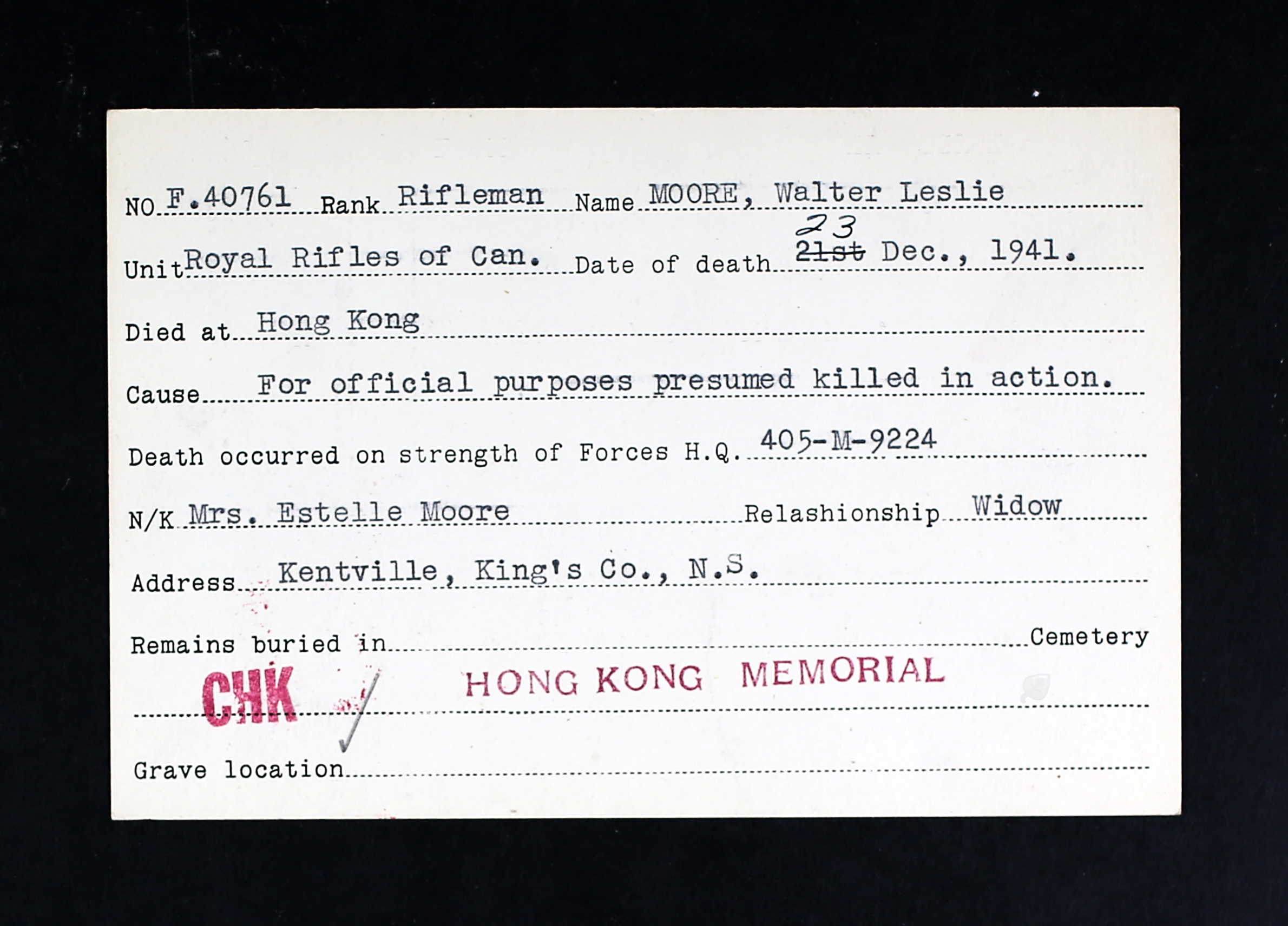 Son of Charles Henry Moore and Bertha Christina Shay, of Kentville, Nova Scotia. Husband of Estelle Florence Wheaton, of Kentville, Nova Scotia. Brother of Private Raymond Moore, who died on June 7, 1944, while serving with the North Nova Scotia Highlanders.