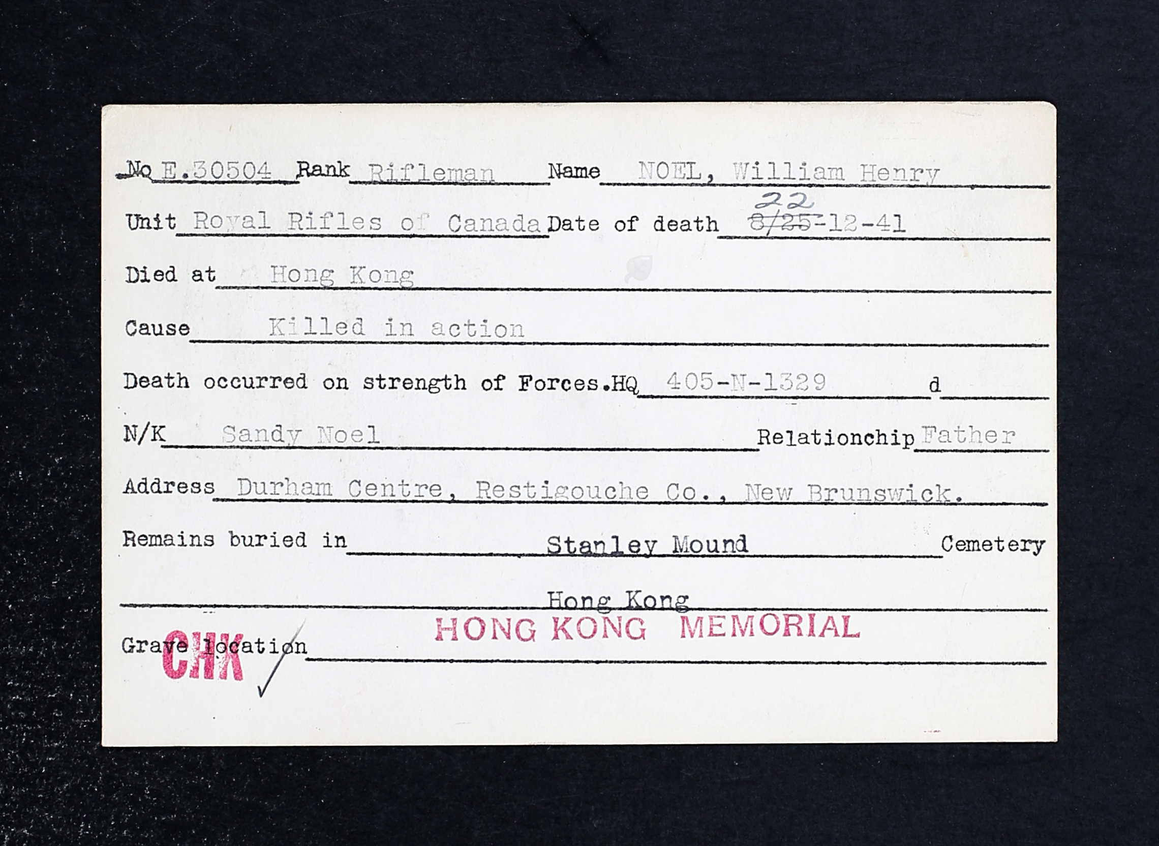 He served in Québec, in New Brunswick, in Newfoundland with Force W and in Hong Kong with Force C. He had 462 days of service, including 56 overseas.