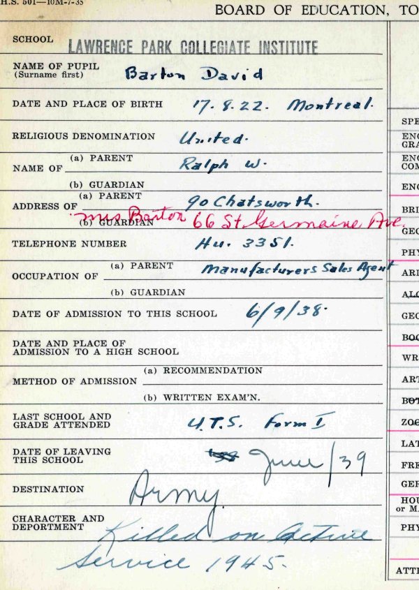 Son of Ralph William and Jessie Hilda Barton, of Toronto, Ontario.