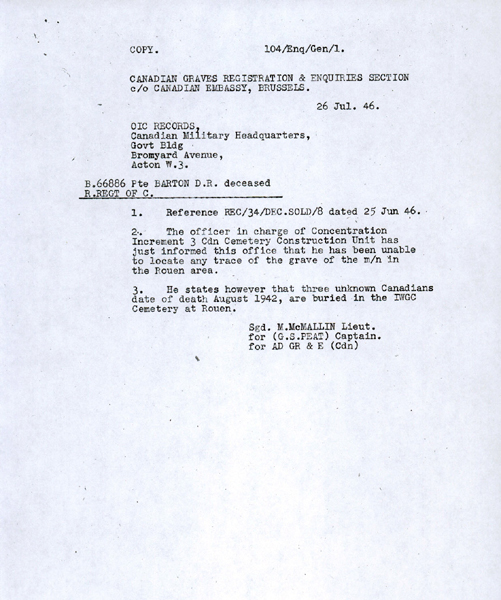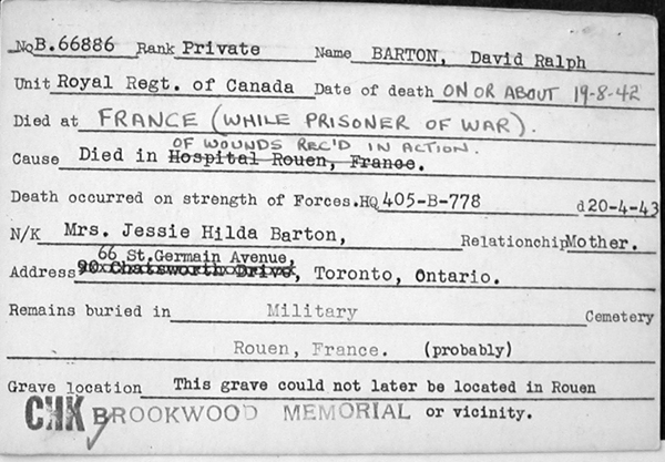 The names of over 200 Canadians are remembered on the Brookwood Memorial. Some perished in ships that were sunken in waters outside the territorial limits of any major campaign; some were lost overboard; some died from various causes on hospital ships or troop transports and were given burial at sea. Also commemorated are those who died during the campaign in Norway in 1940, and in raids on enemy-occupied territory in Europe, including the costly operation against Dieppe in August 1942.