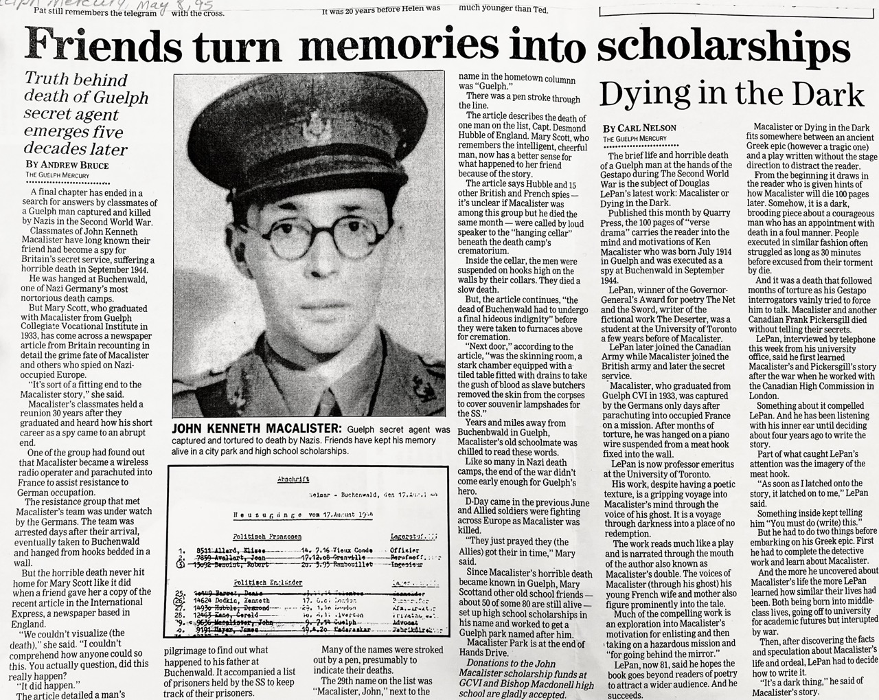 Captain MacAlister, an alumni of the University of Toronto was honoured on September 15, 2004 at a wreath-laying at a small garden dedicated to him and his fellow Special Operations Executive agent, Captain Frank Pickersgill at the foot of the University's Soldiers Tower.