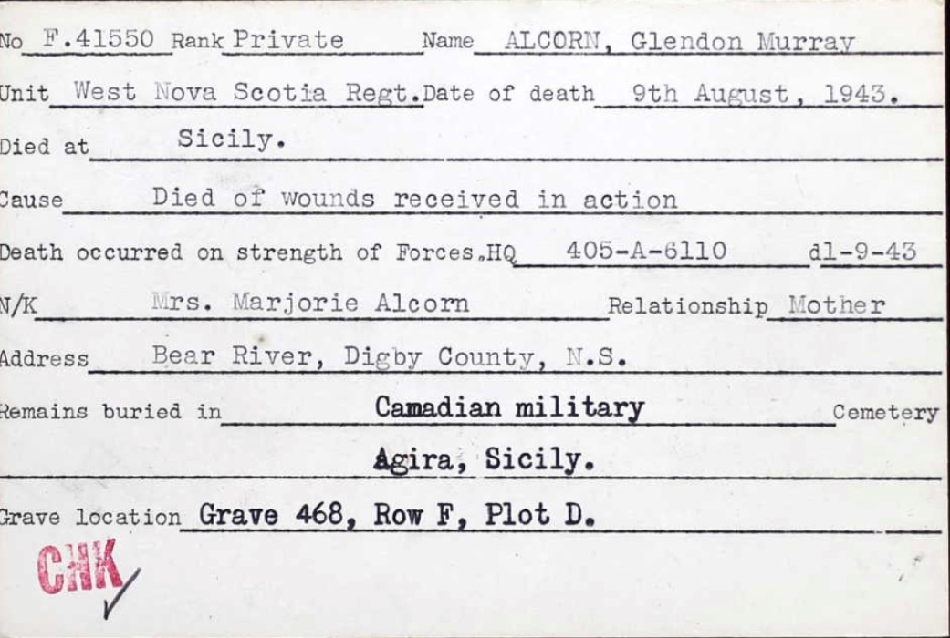 On 10 July 1943, following the successful conclusion of the north African campaign in mid May, a combined allied force of 160,000 Commonwealth and American troops invaded Sicily as a prelude to the assault on mainland Italy. The Italians, who would shortly make peace with the Allies and re-enter the war on their side, offered little determined resistance but German opposition was vigorous and stubborn. The campaign in Sicily came to an end on 17 August when the two allied forces came together at Messina, but failed to cut off the retreating Axis lines. Agira was taken by the 1st Canadian Division of 28 July and the site for the war cemetery was chosen in September for the burial of all Canadians who had been killed in the Sicily campaign. Agira Canadian War Cemetery contains 491 Commonwealth burials of the Second World War.