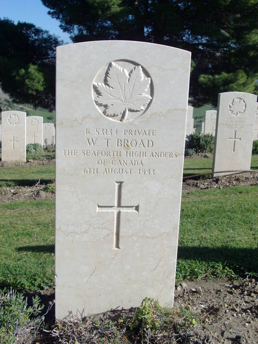 On 10 July 1943, following the successful conclusion of the north African campaign in mid May, a combined allied force of 160,000 Commonwealth and American troops invaded Sicily as a prelude to the assault on mainland Italy. The Italians, who would shortly make peace with the Allies and re-enter the war on their side, offered little determined resistance but German opposition was vigorous and stubborn. The campaign in Sicily came to an end on 17 August when the two allied forces came together at Messina, but failed to cut off the retreating Axis lines. Agira was taken by the 1st Canadian Division of 28 July and the site for the war cemetery was chosen in September for the burial of all Canadians who had been killed in the Sicily campaign. Agira Canadian War Cemetery contains 491 Commonwealth burials of the Second World War.