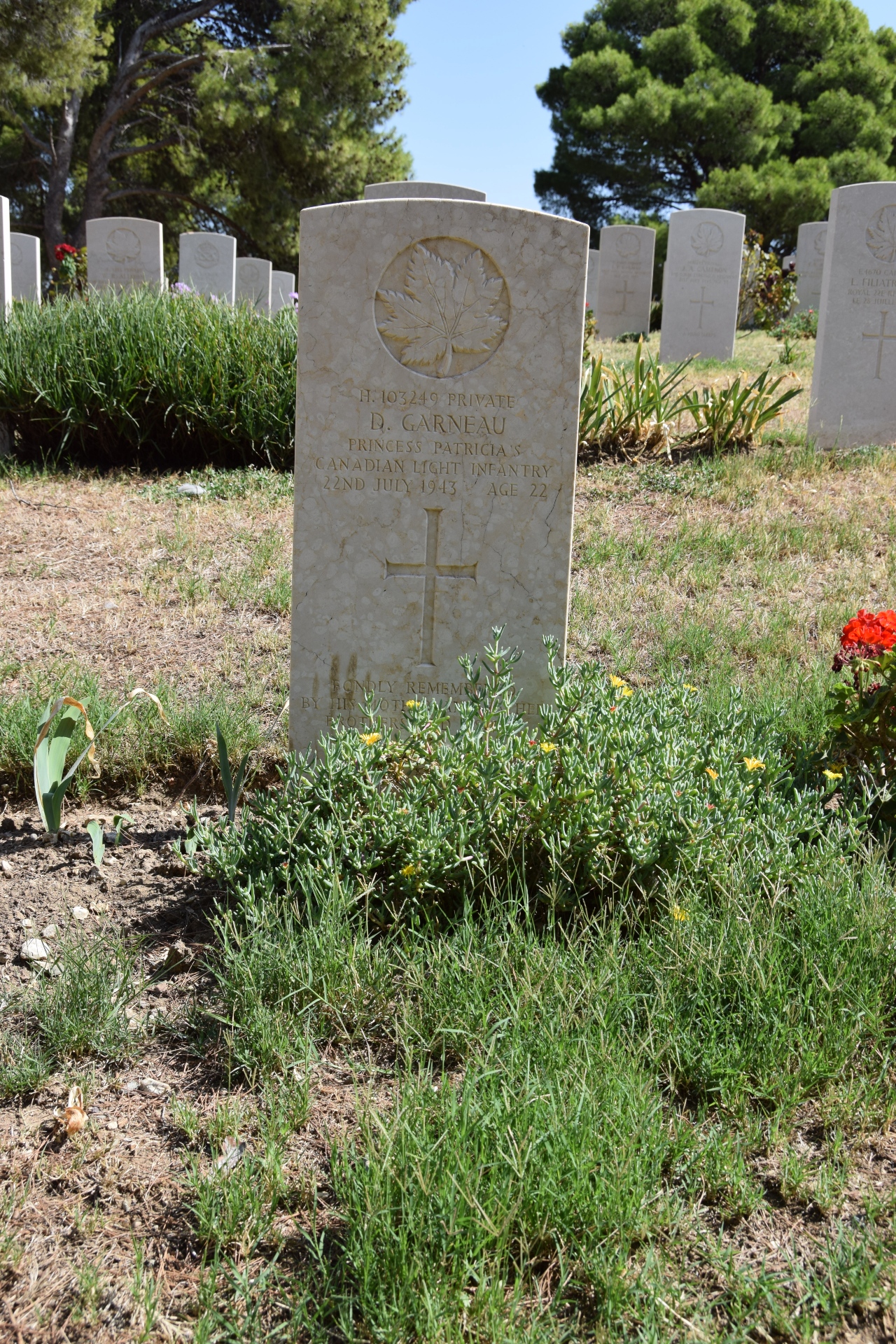 On 10 July 1943, following the successful conclusion of the north African campaign in mid May, a combined allied force of 160,000 Commonwealth and American troops invaded Sicily as a prelude to the assault on mainland Italy. The Italians, who would shortly make peace with the Allies and re-enter the war on their side, offered little determined resistance but German opposition was vigorous and stubborn. The campaign in Sicily came to an end on 17 August when the two allied forces came together at Messina, but failed to cut off the retreating Axis lines. Agira was taken by the 1st Canadian Division of 28 July and the site for the war cemetery was chosen in September for the burial of all Canadians who had been killed in the Sicily campaign. Agira Canadian War Cemetery contains 491 Commonwealth burials of the Second World War.