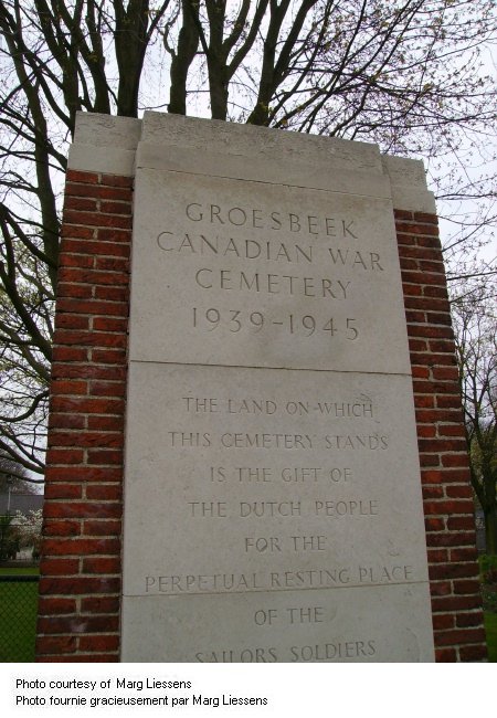 Groesbeek is located 10 km south east of the town of Nijmegen and close to the German frontier. The Groesbeek Canadian War Cemetery is 3 km north of the village and 1500 metres east of the main road to Nijmegen. On leaving the A73 motorway at the junction Overasselt Mook Groesbeek follow directions to Mook. Follow direction signs towards Mook War cemetery. After passing Mook War cemetery continue to the village of Groesbeek to a set of traffic lights. Turn left at the lights onto Dorpstraat passing through Groesbeek. The road name then changes to Molenweg. A Commonwealth War Graves Commission direction sign indicates the right hand turning from Molenweg onto the Zeven Heuvelenweg. The Groesbeek Canadian War Cemetery is located on the right hand side, about 1 km after entering this road.