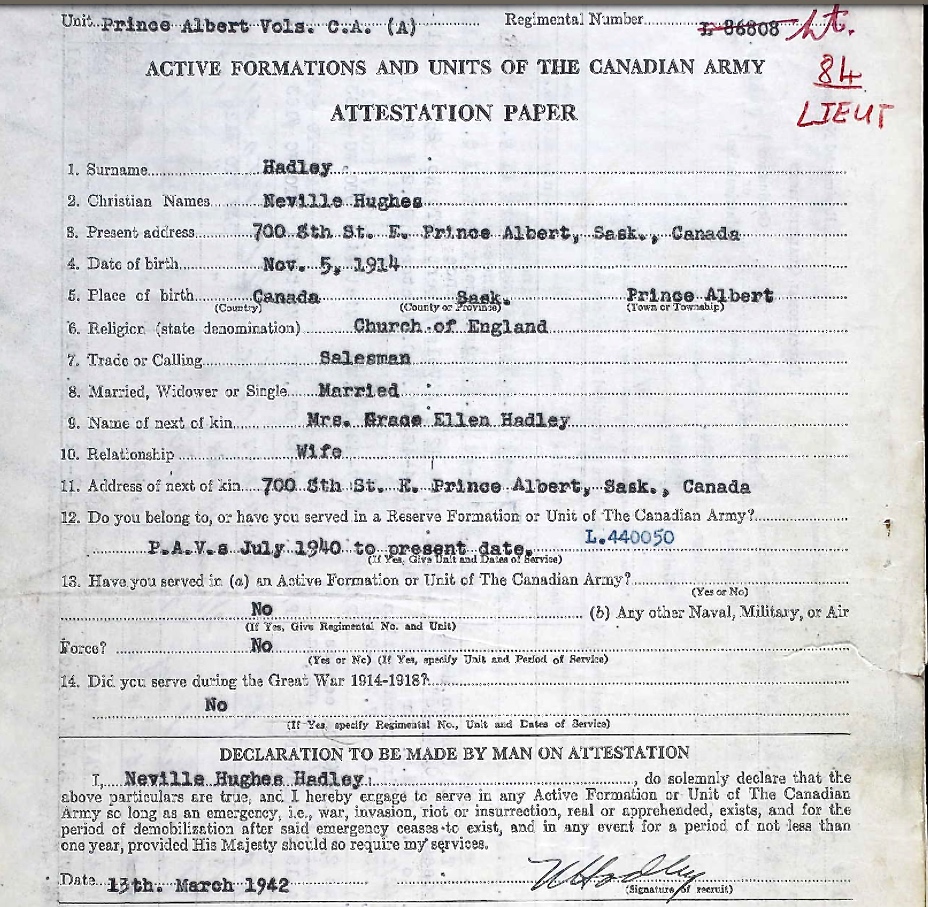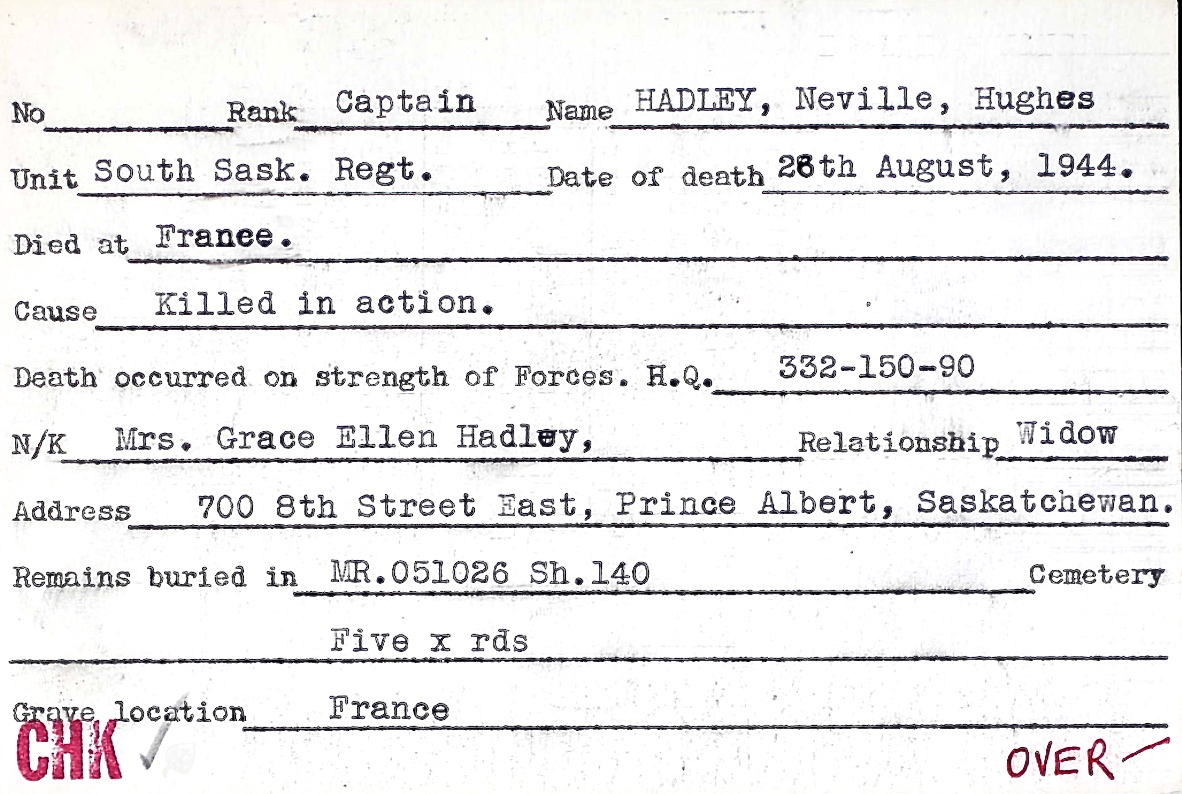 Son of C. W. and Pearl Hadley, of Prince Albert, Saskatchewan. Husband of Grace Ellen Hadley, of Prince Albert.