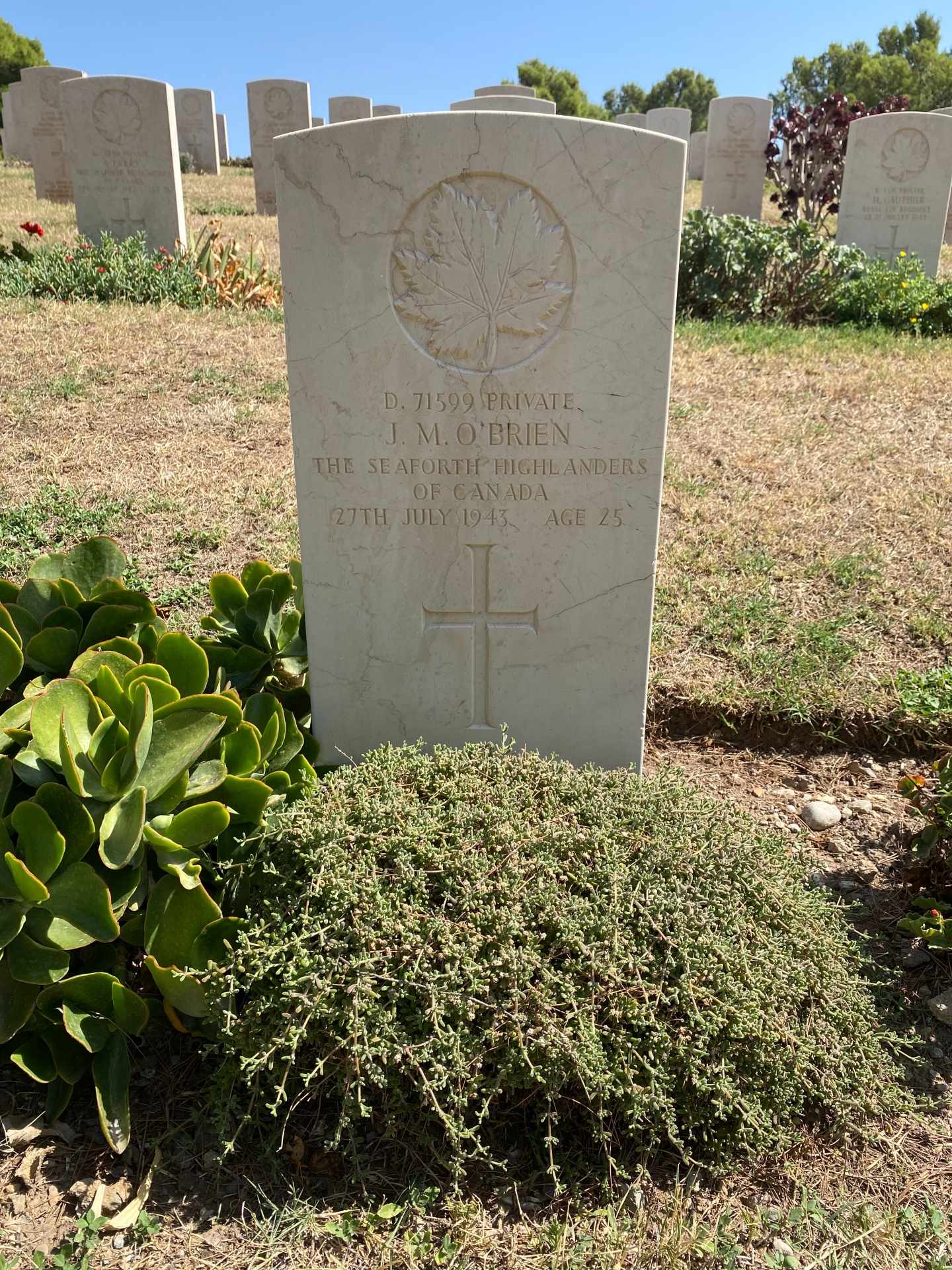 On 10 July 1943, following the successful conclusion of the north African campaign in mid May, a combined allied force of 160,000 Commonwealth and American troops invaded Sicily as a prelude to the assault on mainland Italy. The Italians, who would shortly make peace with the Allies and re-enter the war on their side, offered little determined resistance but German opposition was vigorous and stubborn. The campaign in Sicily came to an end on 17 August when the two allied forces came together at Messina, but failed to cut off the retreating Axis lines. Agira was taken by the 1st Canadian Division of 28 July and the site for the war cemetery was chosen in September for the burial of all Canadians who had been killed in the Sicily campaign. Agira Canadian War Cemetery contains 491 Commonwealth burials of the Second World War.