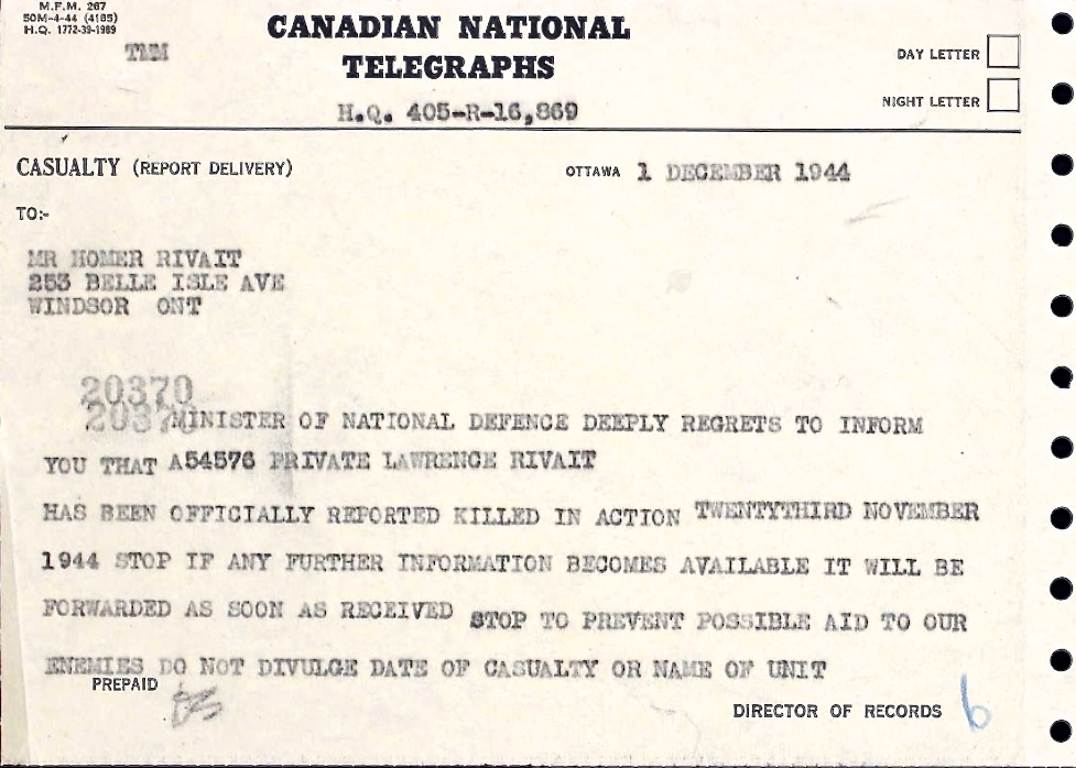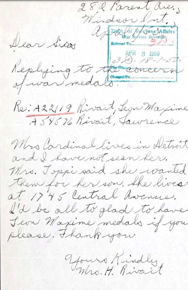 Son of Homer and Bernadette Rivait (1964 National Memorial (Silver) Cross Mother), of Windsor, Ontario. Husband of Joan Hilda (nee Jarrett) Rivait. Father of Anthony Lawrence of Windsor, Ontario.