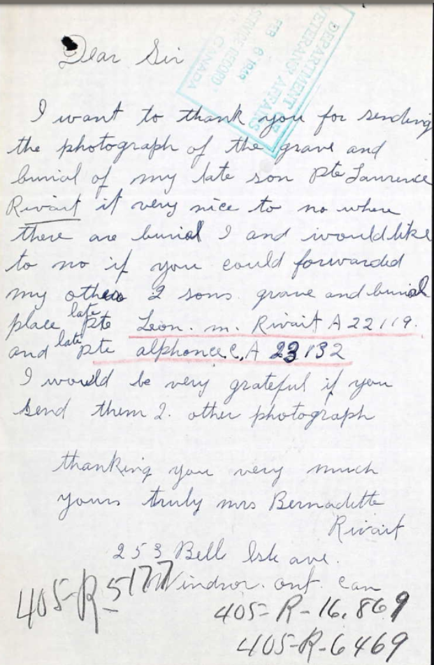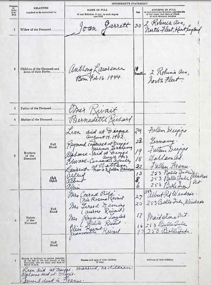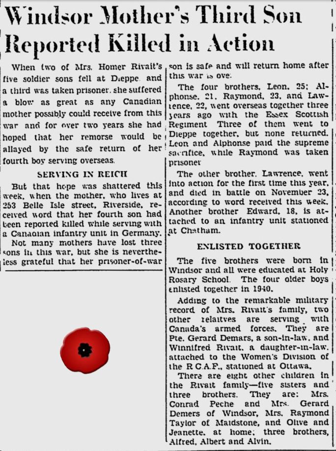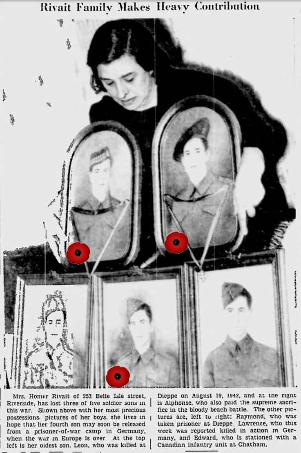 His brothers, Alphonse and Leon were killed in action during the Dieppe Raid on August 19, 1942.
