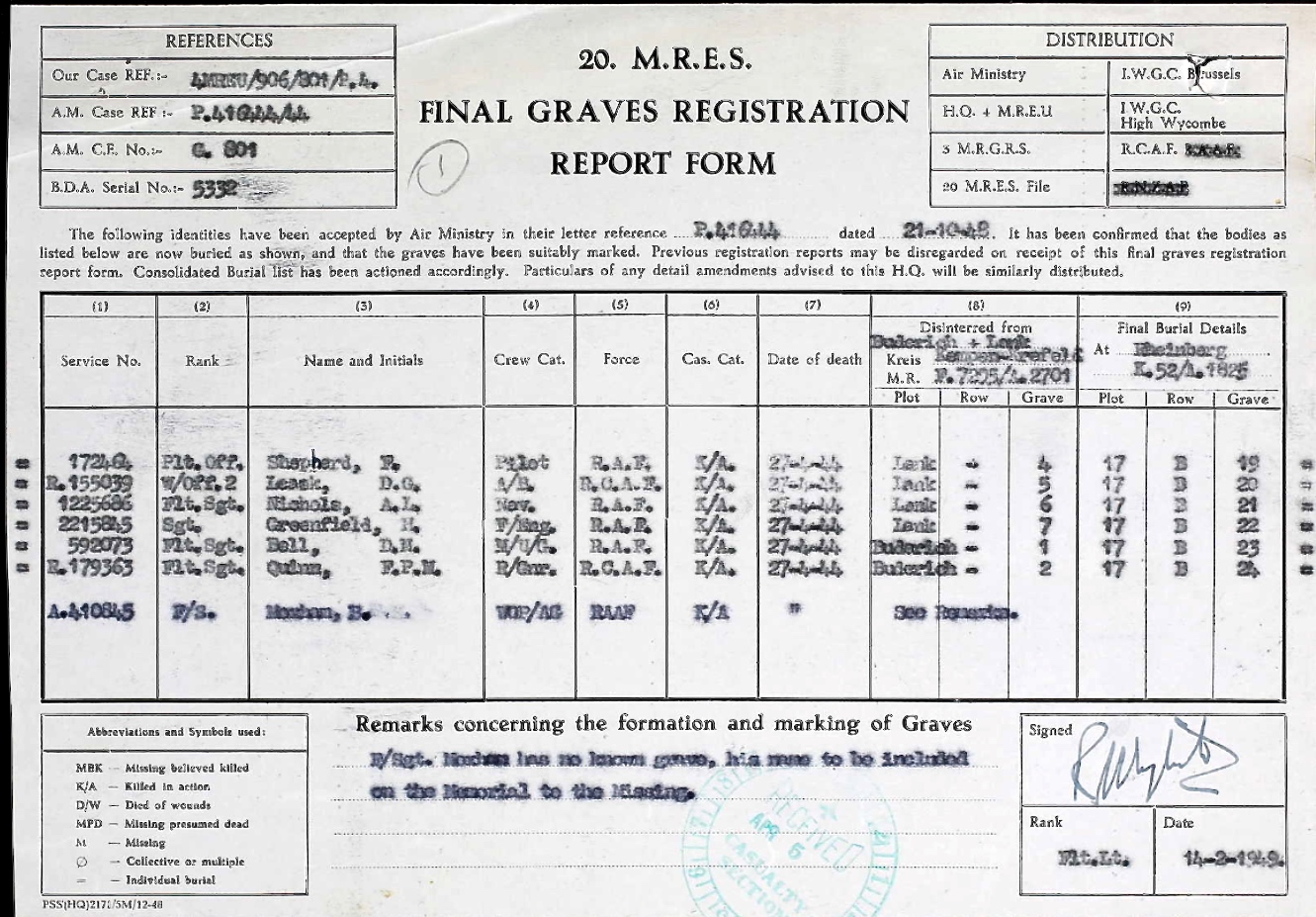 The site of Rheinberg War Cemetery was chosen in April 1946 by the Army Graves Service for the assembly of Commonwealth graves recovered from numerous German cemeteries in the area. The majority of those now buried in the cemetery were airmen, whose graves were brought in from Dusseldorf, Krefeld, Munchen-Gladbach, Essen, Aachen and Dortmund; 450 graves were from Cologne alone. The men of the other fighting services buried here mostly lost their lives during the battle of the Rhineland, or in the advance from the Rhine to the Elbe.