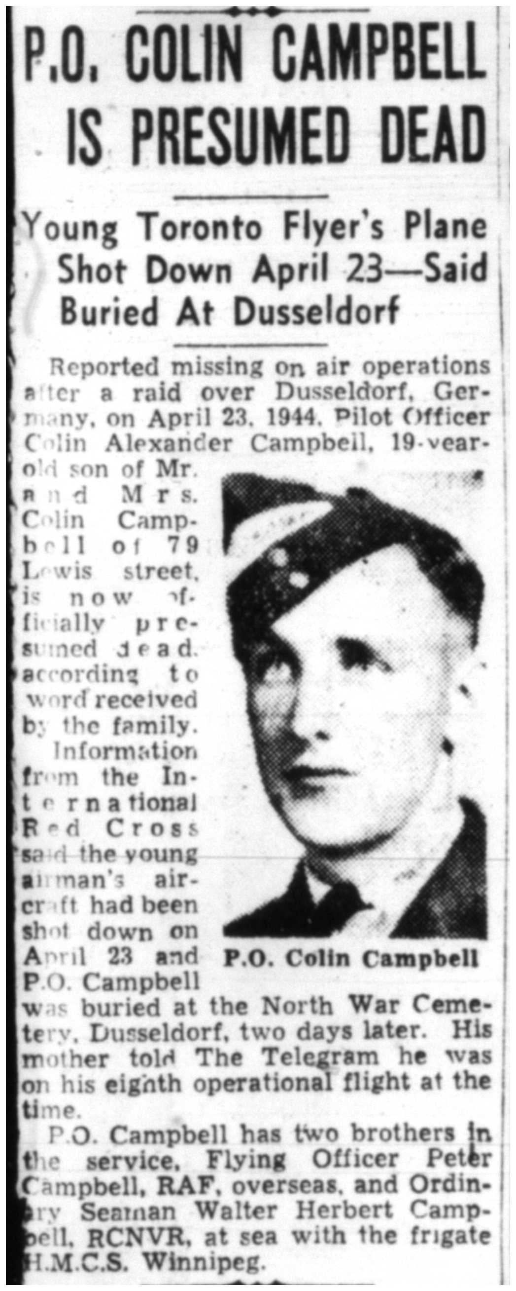 His two brothers served overseas during the Second World War; Peter Campbell, with the Royal Air Force since 1936, and Walter Herbert on board minesweeper HMCS Winnipeg (J337); they both survived the war.