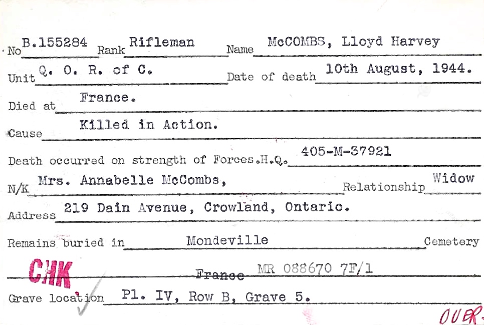 Son of Harley O. and Eric C. McCombs; husband of Annabelle McCombs, of Crowland, Ontario.