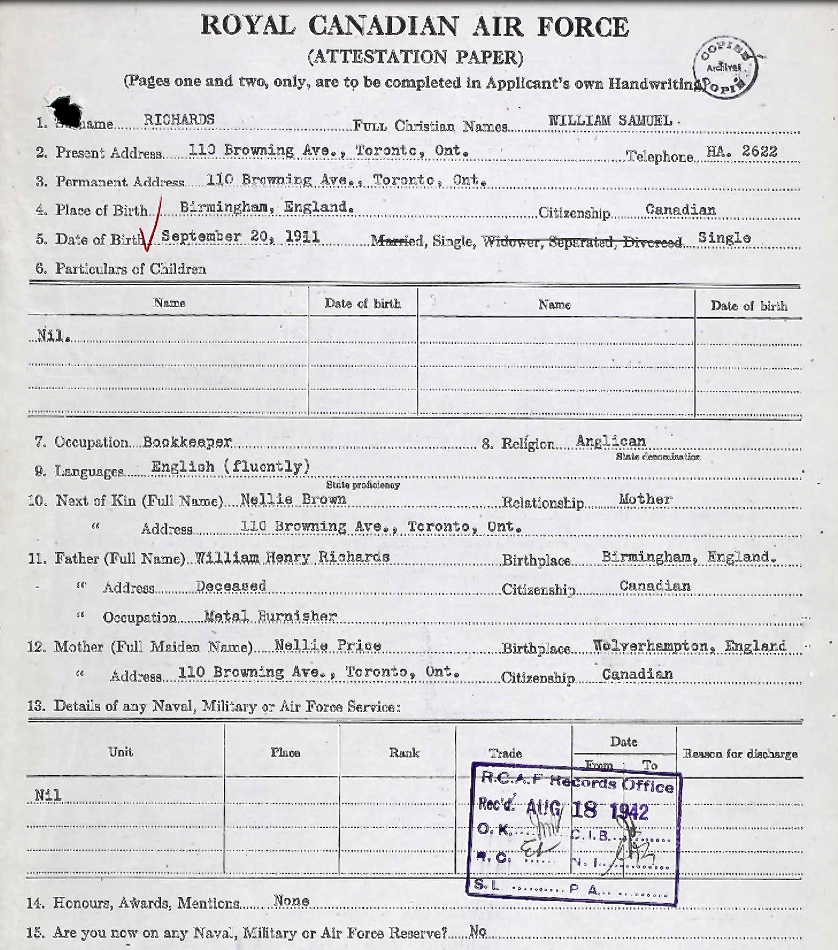 Son of William and Nellie Richards; husband of Madge G. Richards, of Toronto, Ontario.