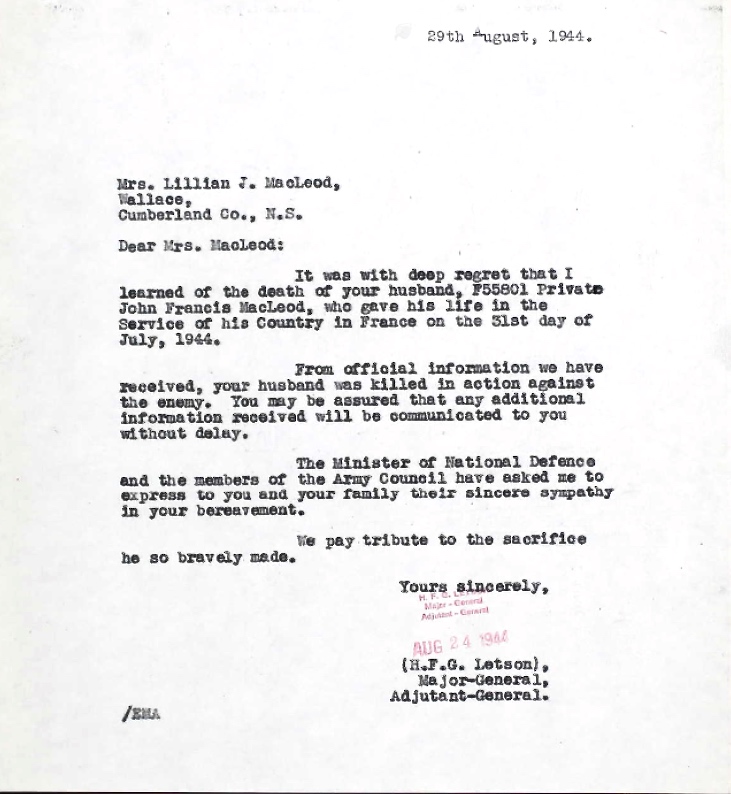 Son of Allan and Salome MacLeod of Prince Edward Island. Husband of Lillian Jean MacLeod, of Halifax, Nova Scotia.