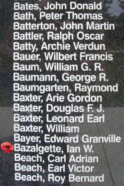 Ian Willoughby Bazalgette was the son of Charles Ian and Marion Edith (née Bunn) Bazalgette. His family moved to Toronto, Ontario in 1923 where received his early education at Balmy Beach School. Then his family moved to England and his education was completed at Rokeby, the Downs, Wimbledon and by private tutor. In September 1940 he received a commission in the Royal Artillery and the following year he transferred to the Royal Air Force Volunteer Reserve. In the autumn of 1942 he was posted to No. 115 Squadron, R.A.F. for flying duties. In September 1943 he went to an operational training unit as an instructor and in April 1944 he was posted to No. 635 (Pathfinder) Squadron as a flight commander with the rank of Squadron Leader. He earned a Distinguished Flying Cross in Italy on 9 July 1943. In 1949 a mountain in Jasper National Park was named after him. Squadron-Leader Bazalgette is buried in the military plot in Senantes Churchyard, Oise, France about twelve miles west-north-west of Beauvais. His medal is on display at the R.A.F. Hendon Museum in England. During the summer of 1990 at the Nanton Lancaster Museum in Nanton, Alberta, a plaque was unveiled by Mrs. Ethel Broderick, Ian Bazalgette's sister, and the markings of the Bazalgette aircraft (F2-T) were unveiled by Chuck Godfrey DFC, his wireless operator on the VC flight, and George Turner, his flight engineer. Flypasts included an armed forces CF-5 and an Aurora from No. 407 Squadron in Comox. Hamish Mahaddie, an RAF legend who arranged for Ian to join the Pathfinders and Larry Melling DFC, a pilot who flew with "Baz" on No. 635 Squadron were special guest speakers at the banquet. Master of Ceremonies was Duke Warren DFC.