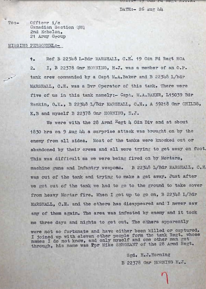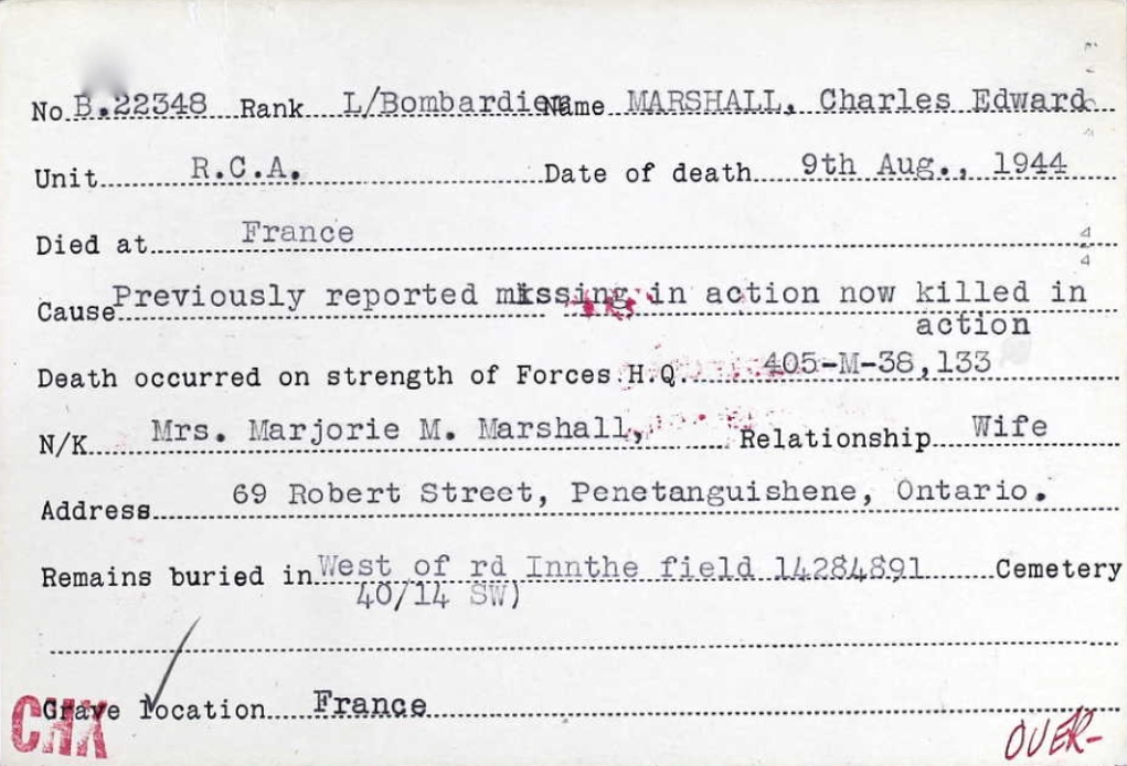 Husband of Mrs. Marjorie (née Quigley) Marshall of Penetanguishene, Ontario. Son-in-law of Mrs. Simon Lortie of Penetanguishene, Ontario.