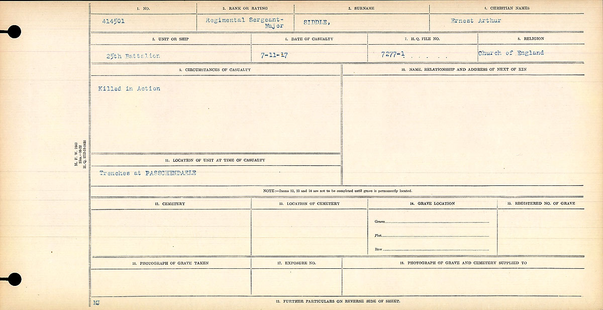 Husband of Maude Siddle, of 39, Harvard St., Halifax, Nova Scotia. Instructor of Officers' Class at Amherst, Nova Scotia.