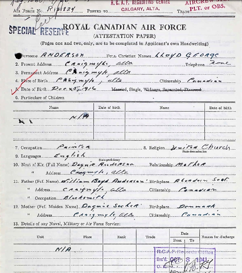 Son of William Boyd and Dagnie Asti Anderson (1959 National Memorial (Silver) Cross Mother), of Craigmyle, Alberta.