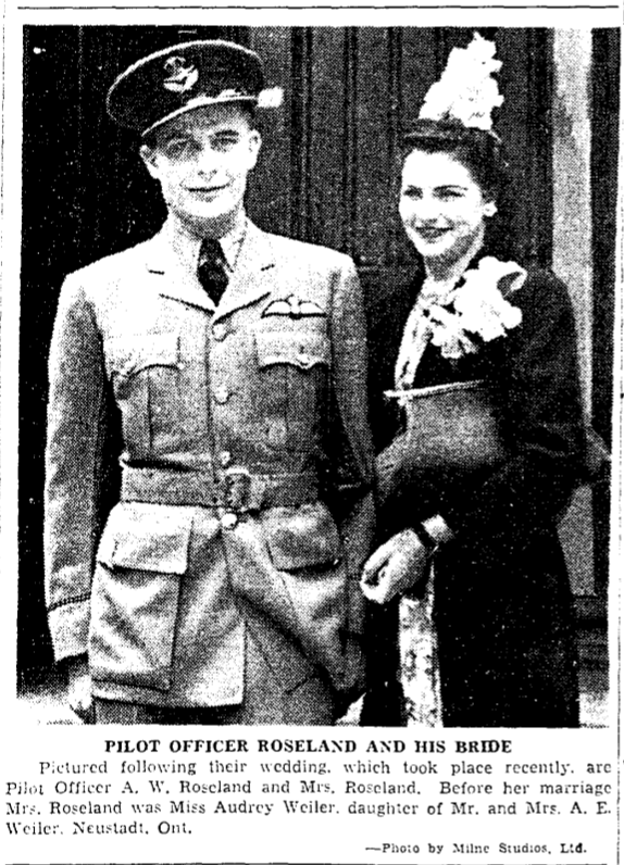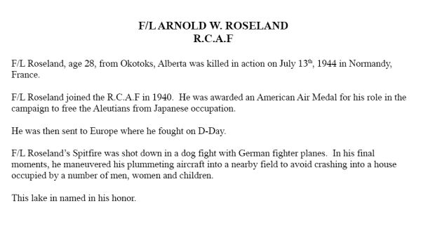 Son of Gustav Andrew and Anna (née Kyland) Roseland of Okotoks, Alberta. Husband of Audrey Edith Weiler (remarried Arnold) and father of Ronald Keith and Garry Lee. Brother of Ernest Gustav, Erling Arthur, Magnald, Gudrun, Alfhid, Hidur and Agnes. While attached to the 11th Air Force of U.S.A.A.F. Flight Lieutenant Roseland was awarded the US Air Medal.