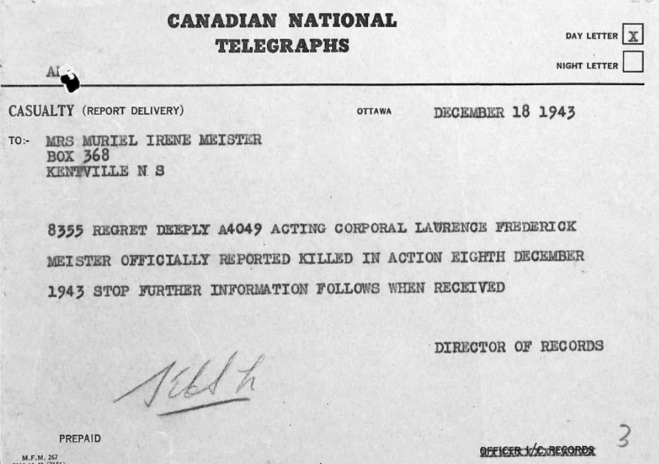Corporal Lawrence Frederick Meister has been honoured by having Meister Lake named after him. The location of Meister Lake is in Yukon (105B06- 60° 19’ 37”- 130° 22’ 14”).