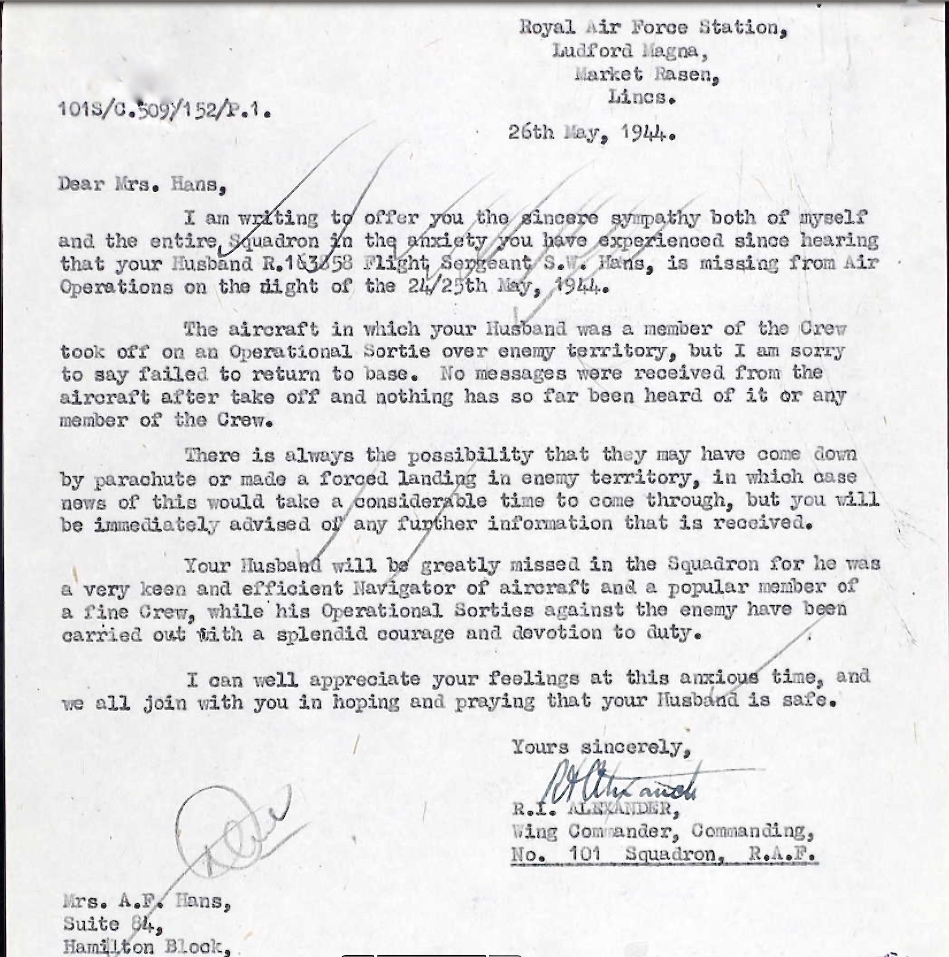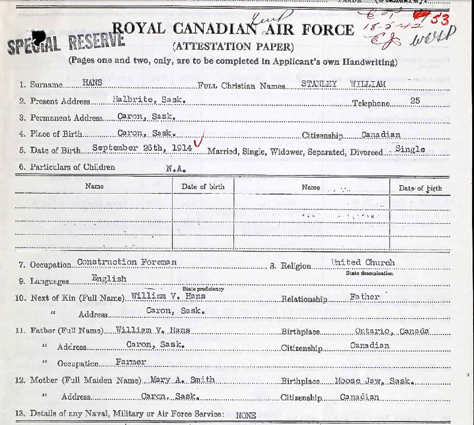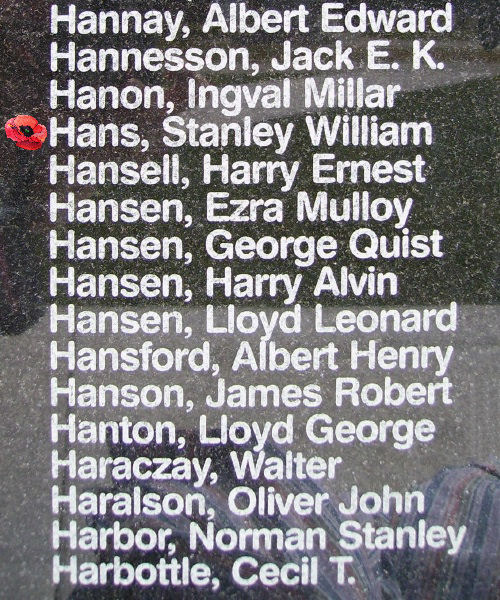 He hailed from Caron, Saskatchewan. The Province of Saskatchewan has honoured Flight Sergeant Hans by naming Hans Lake in his honour.