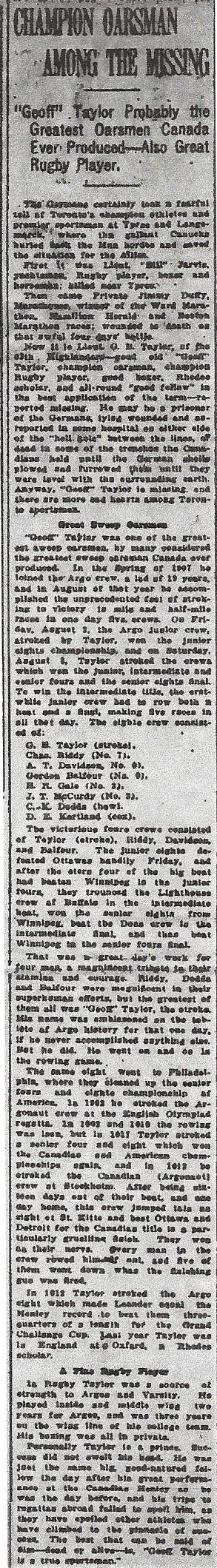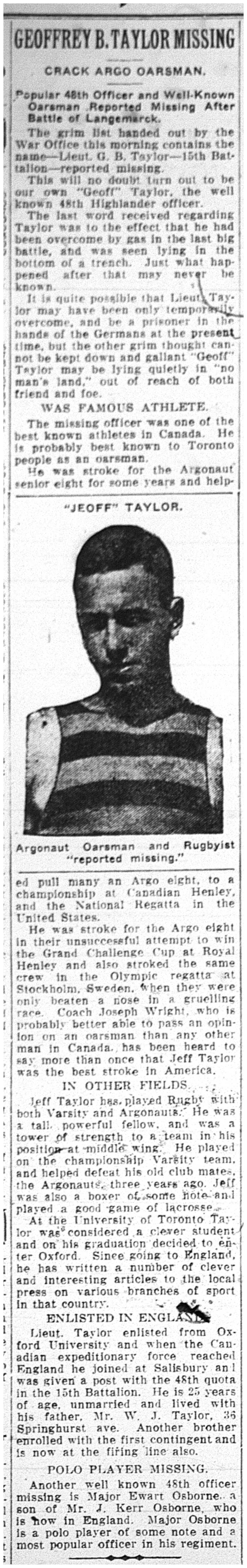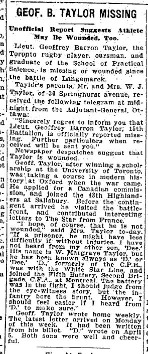 Son of William John Mahaffy Taylor and Stella Bertha Taylor, of 49 Heath St. West, Toronto, Ontario. He was attending Trinity College, Oxford, when war broke out and he joined the Battalion on its arrival in England.