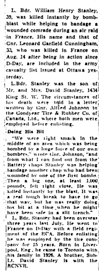 Son of David Henry and Phoebe Elizabeth Gertrude Stanley, of Toronto, Ontario.