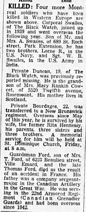 Son of Alfred and Margaret Elena Stewart Swailes, of Montreal, Province of Quebec.