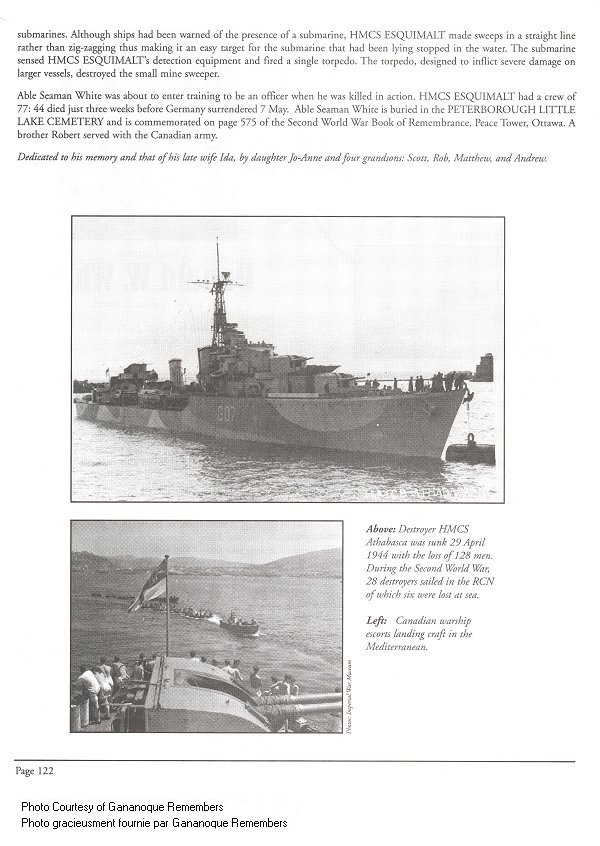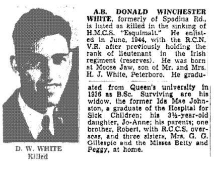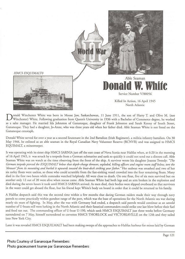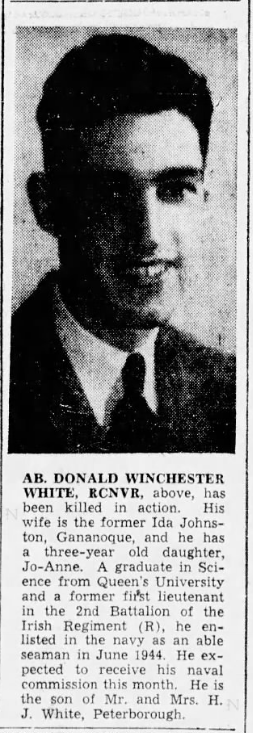 Son of Henry James White and Olive M. White, of Peterborough, Ontario; Husband of Ida M. White, of Gananoque,Ontario.