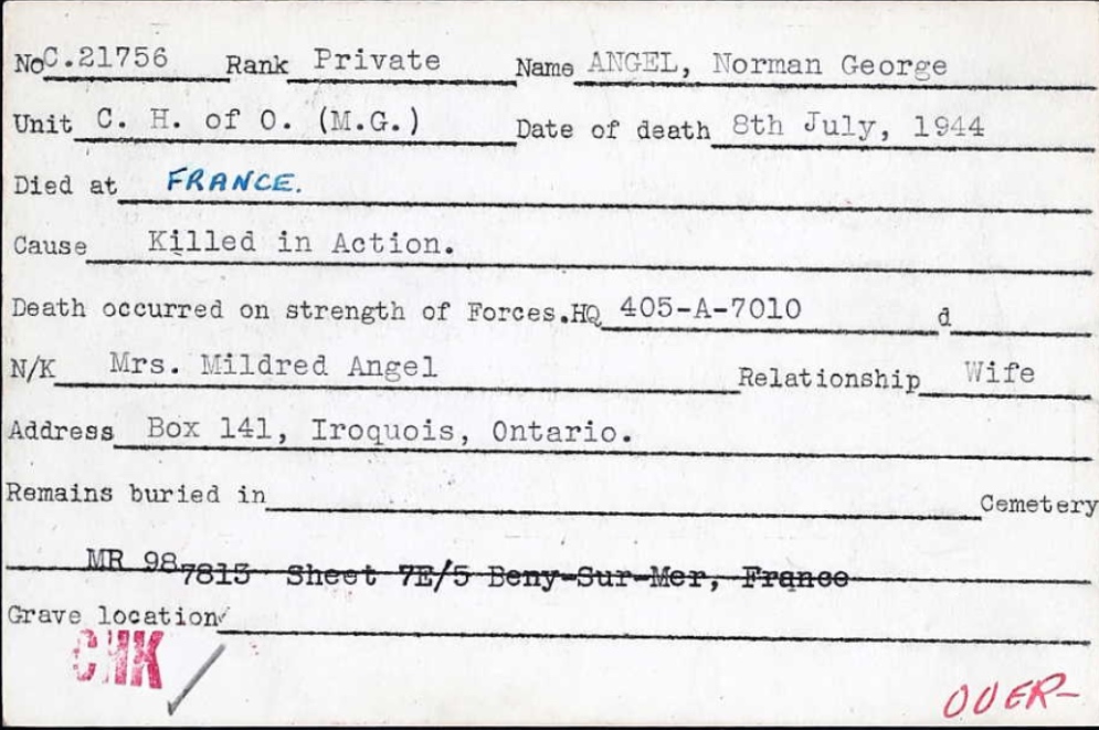 Brother of Private Harold Sandford Angel, who died on June 9, 1944, while serving with the Cameron Highlanders of Ottawa.