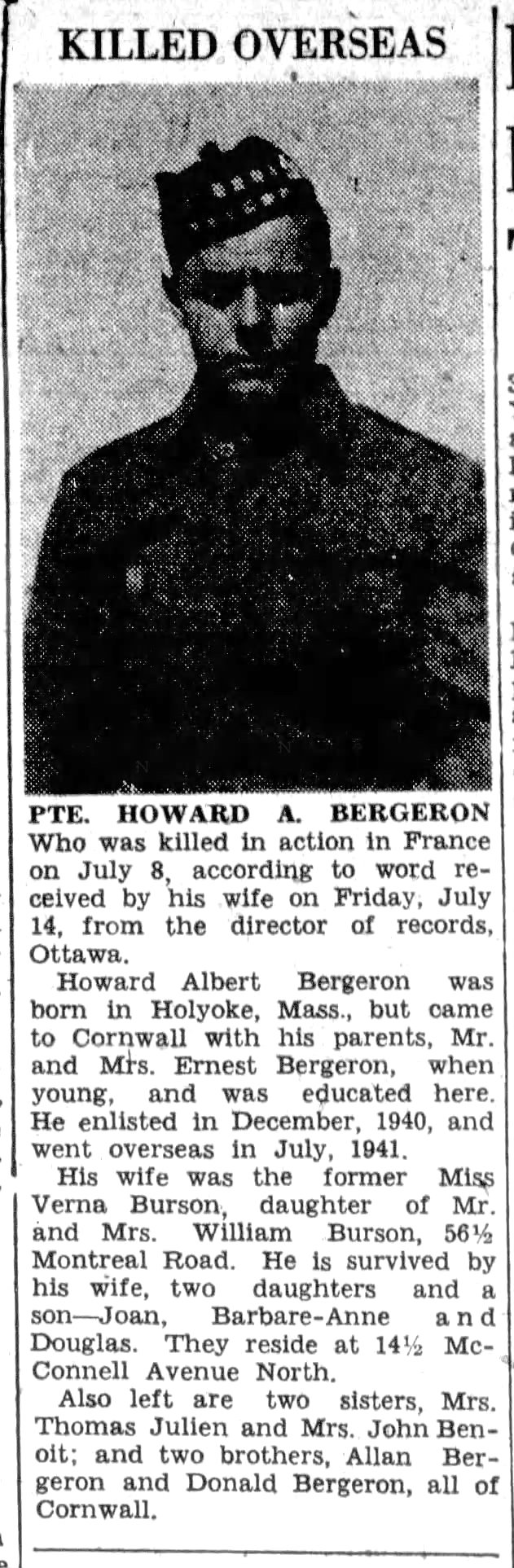 Son of Ernest Bergeron and Annie Bergeron (nee Sheared). Husband of Verna Bergeron (nee Burson), of Moose Creek, Ontario.