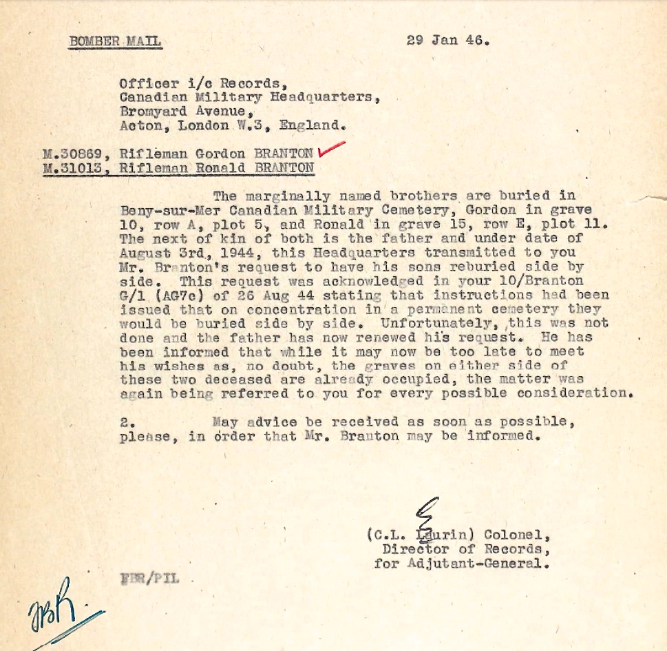 Brother of Rifleman Gordon Branton, who died while serving with the Regina Rifle Regiment.
