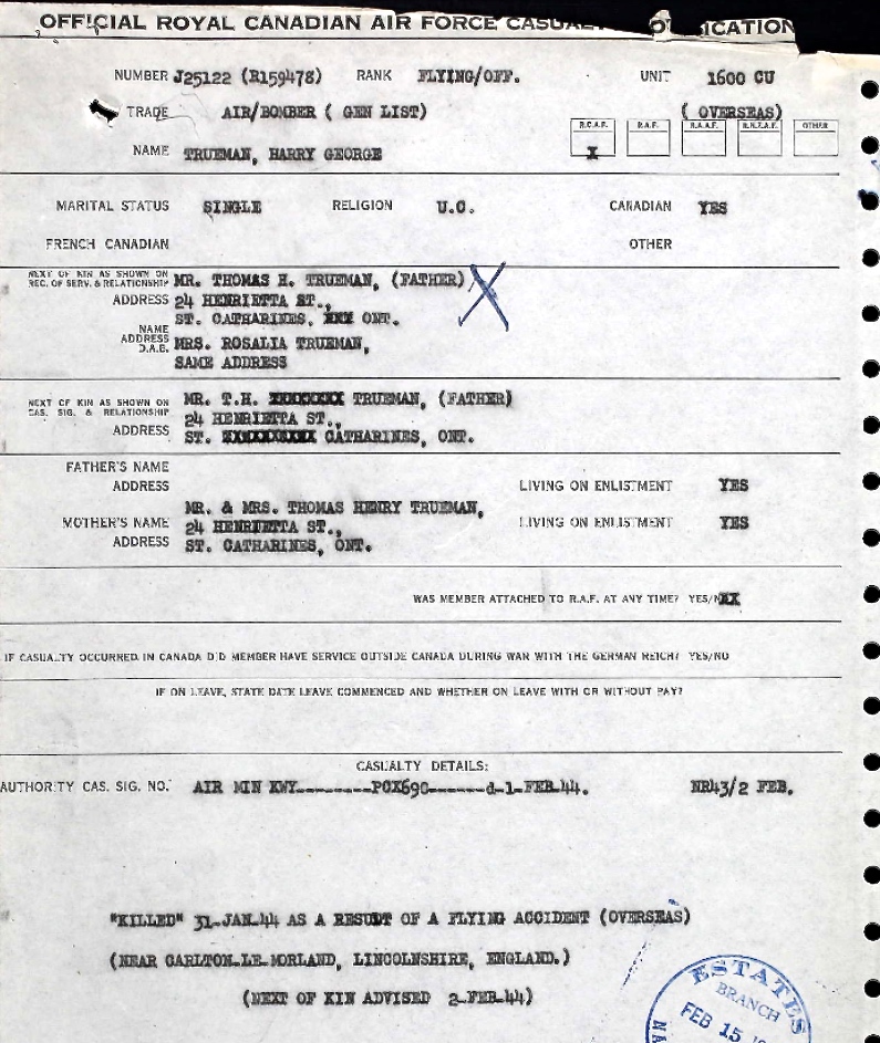 Son of Thomas H. Trueman and Rosalia A. Trueman, of St. Catharines, Ontario, Canada.