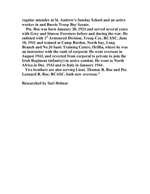 Son of John and Christina Roe, of Ingersoll, Ontario, Canada.