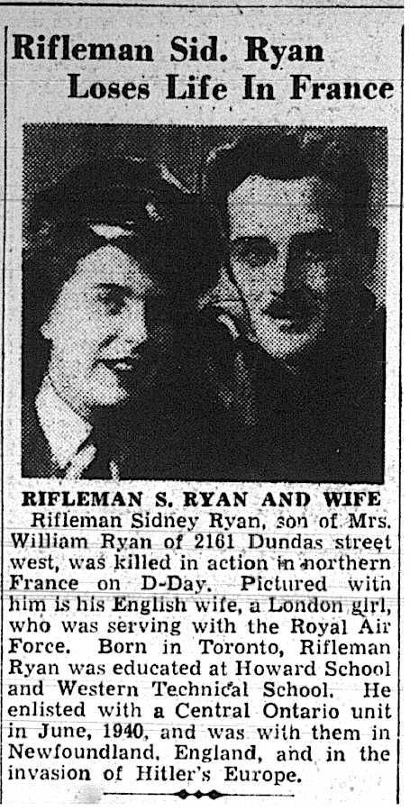 Son of William and Pearl Ryan, of Toronto, Ontario. Husband of Priscilla Elsie Ryan, of Toronto, Ontario.