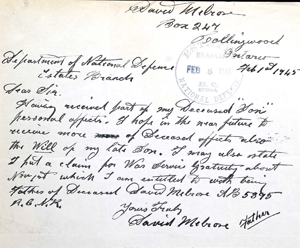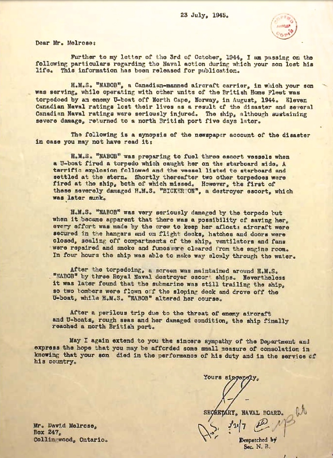 Son of Mr. and Mrs. David Melrose, of Collingwood, Ontario, Canada.