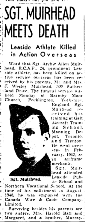 Son of James Wesley Muirhead, and of Jessie Simpson Muirhead (nee Murray), of Toronto, Ontario.
