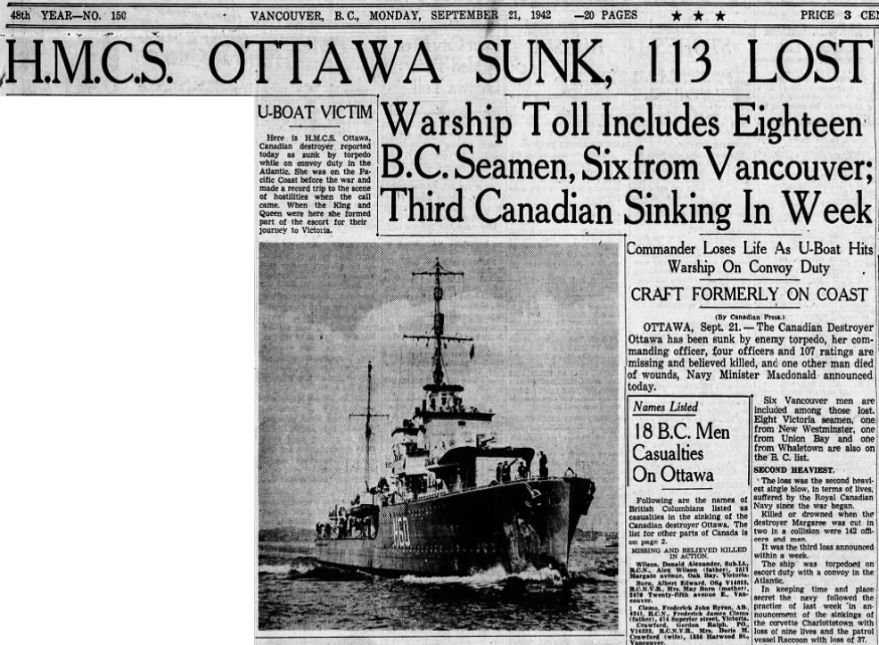 The HALIFAX MEMORIAL in Nova Scotia's capital, erected in Point Pleasant Park, is one of the few tangible reminders of the men who died at sea. Twenty-four ships were lost by the Royal Canadian Navy in the Second World War and nearly 2,000 members of the RCN lost their lives.