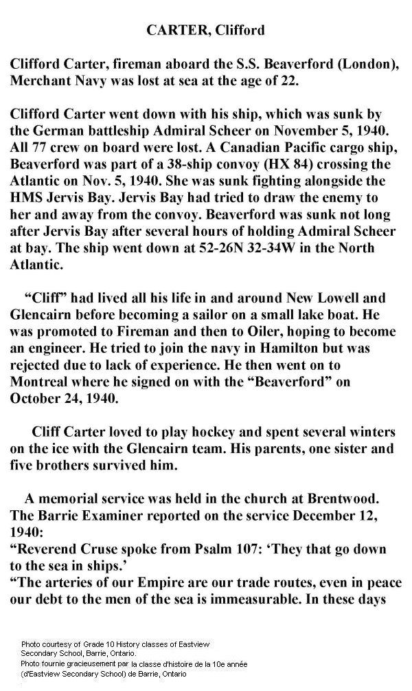 Son of Roy Wesley Carter and Della Edna McGibbon, of Barrie, Ontario. Brother of Gunner Wallace Wilfred Carter, regimental number B-53573, accidentally killed in Villanova, Italy, on December 23, 1944, while serving with the 6th Battalion, 5th Counter-Mortar Regiment, Royal Canadian Artillery, and of Privates Kenneth Roy Carter and Douglas Keith Carter, who fought in Europe. They survived the war.