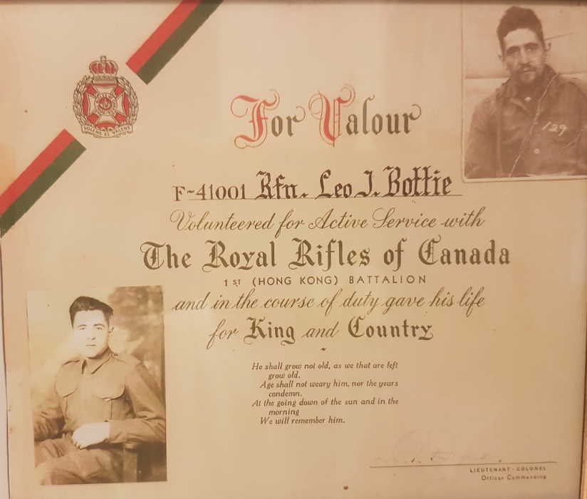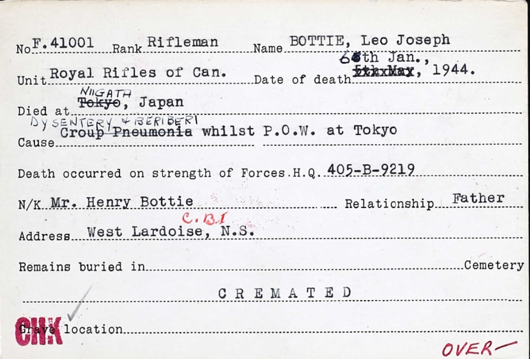 Enlisted with the West Nova Scotia (Rifle) Regiment in Aldershot, Nova Scotia, transferred on 27 November 1940 to the 1st Battalion, Royal Rifles of Canada, he served in New Brunswick, in Newfoundland with Force W, in Québec, in Hong Kong with Force C, in Japan as prisoner of war. He had 1,253 days of service, including 801 overseas. "
