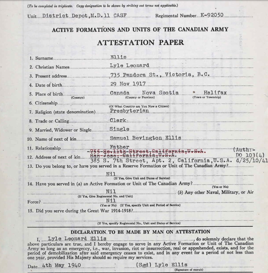Served in British Columbia, Hong Kong with Force C, Japan as a prisoner of war. Had 1,414 days of service, including 872 overseas.