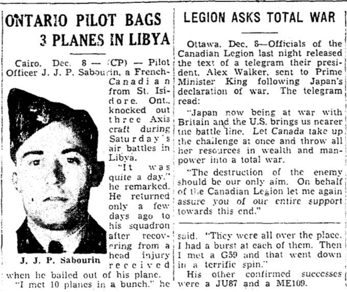 His death occurred on 16 September during air action against Rommel's Army in Libya following a period of widespread activities on both the European and African fronts as a Spitfire pilot. He had already been credited with destroying seven enemy aircraft. He joined the RCAF in June 1940, training in Toronto, Prince Albert and Camp Borden, receiving his Wings in December 1940.