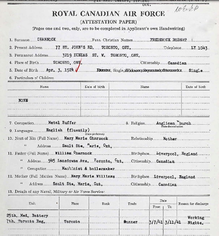 Son of William Charnock and Mary Williams of Toronto, Ontario. Husband of Velma Rae Cramb, of Toronto.