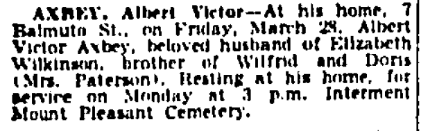Son of Henry J. Axbey and Eva Maria Axbey, of London. Husband of Mary E. Axbey, of Toronto, Ontario.