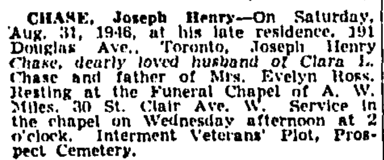 Son of Mr. and Mrs. Alfred Chase, of Toronto; husband of Clara L. Chase. of Toronto.